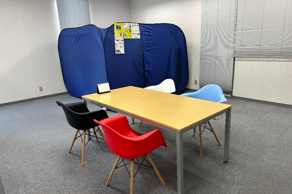 応接室のすぐそばには、お客様が販売している防災テントを展示しています!